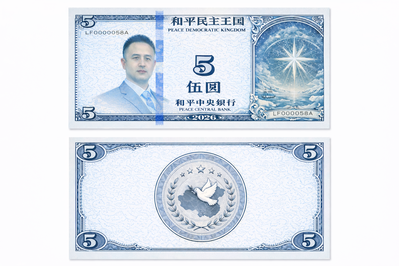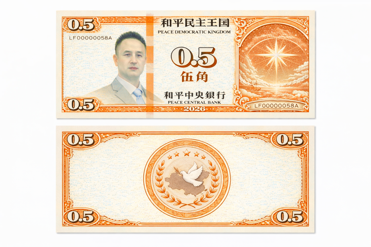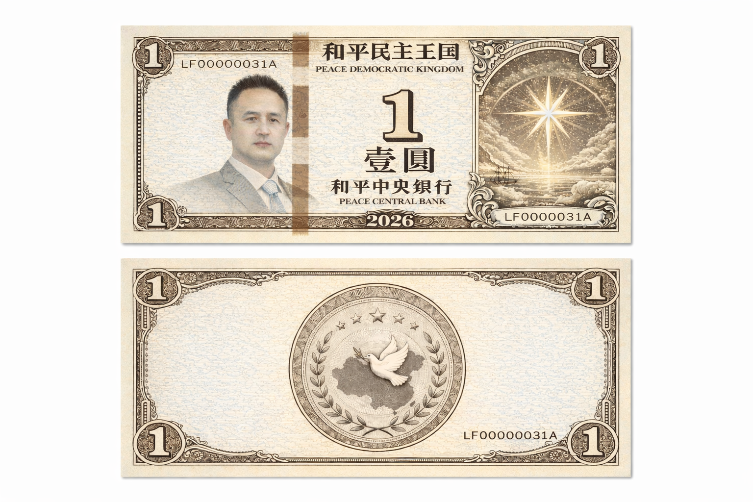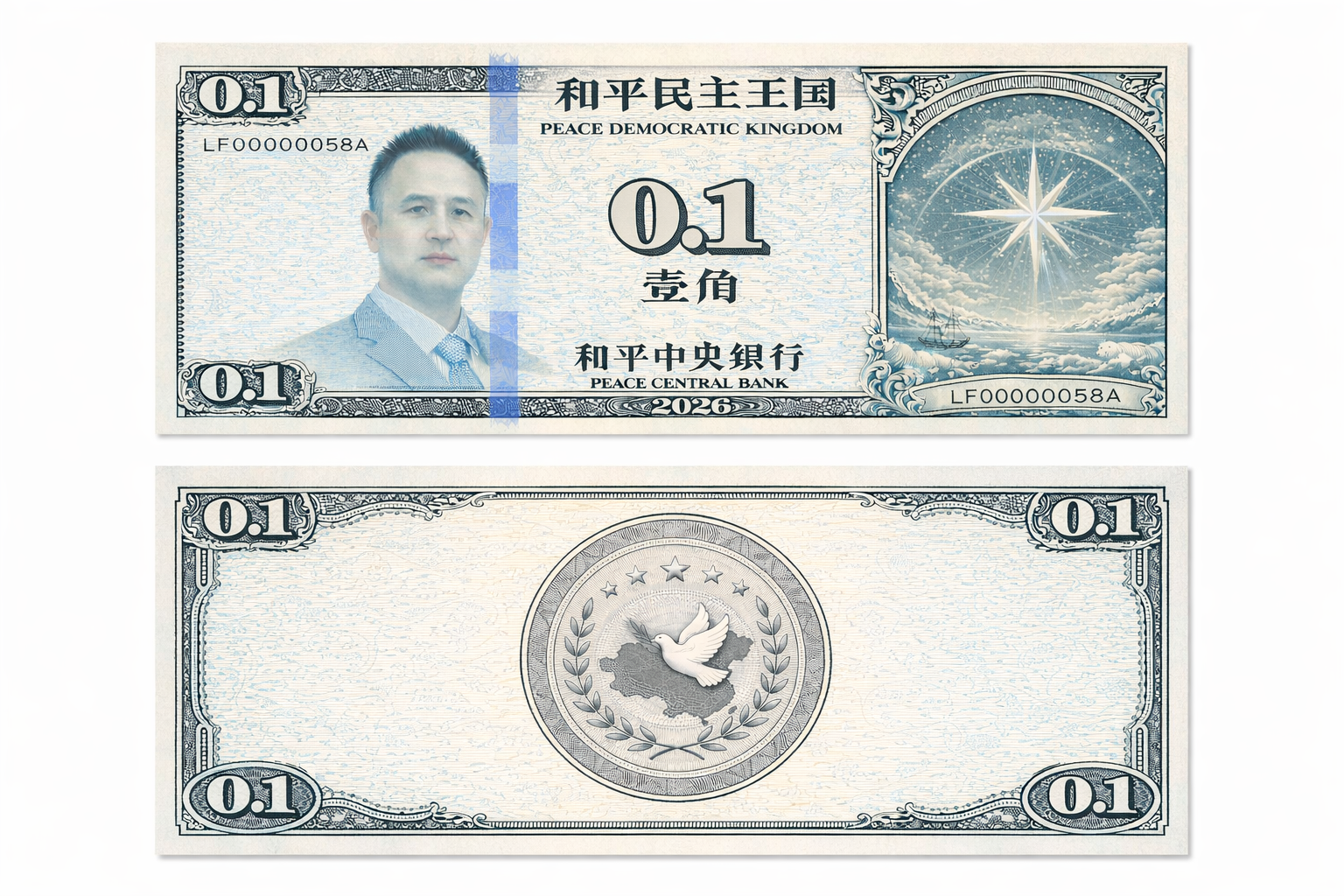 The Peace Coin consists of three symbols: an image of the North Star, an image of Mr. Peace, and an image of a national map. The banknotes will be issued in denominations of 100 yuan, 50 yuan, 20 yuan, 10 yuan, 5 yuan, 1 yuan, 5 jiao, and 1 jiao. An electronic version of the Peace Coin will also be designed and developed as a future national currency. No metal coins will be issued for the Peace Coin. Below is a design sample, an initial concept draft.